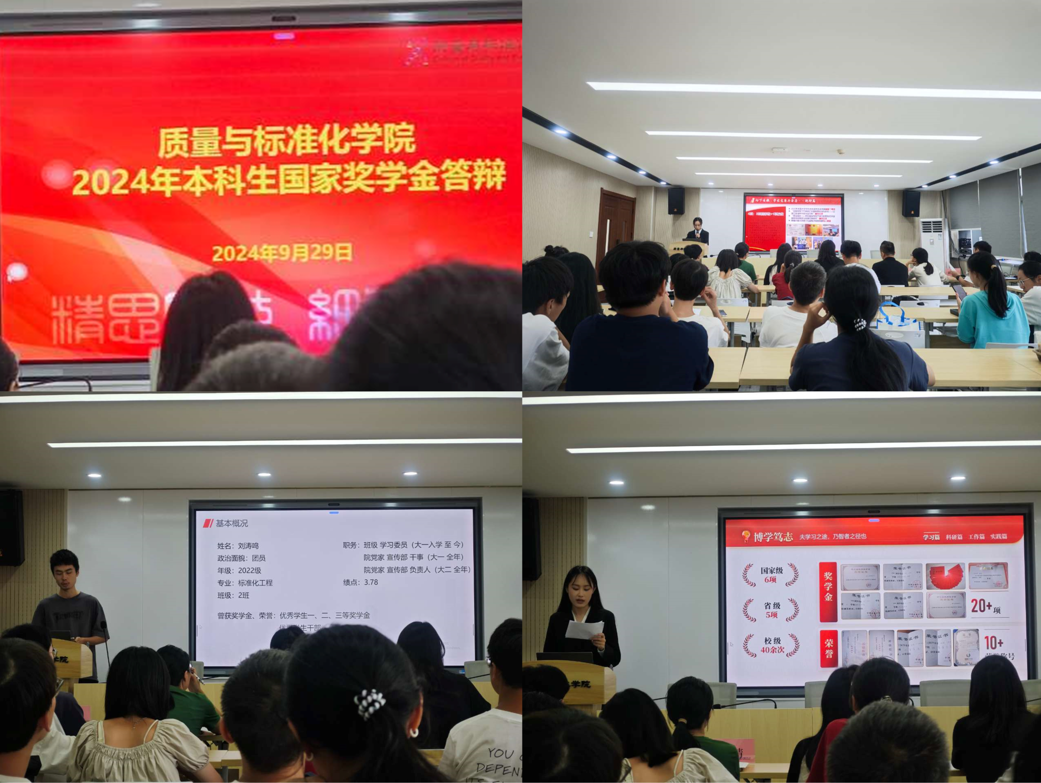 会议期间,七位参与答辩的同学分别就自身在校期间的思想政治表现、学业成绩、创新竞赛、社会实践以及志愿服务等方面进行了 PPT 汇报展示。参与答辩的同学们精神饱满、自信从容。他们以扎实的专业知识、丰富的实践经历和优异的学习成绩,向评委老师们展示了自己在学业、科研、社会实践等方面的突出表现。评委们针对每位选手的答辩情况逐一进行提问,答辩同学依据实际情况予以回答。这让评委老师们更近一步地了解他们大学期间地表现。根据各位评委投票的结果,拟推荐21标准化1班张博妍、21质量(卓越2)班赵韩焘为2023-2024学年度国家奖学金获得者。