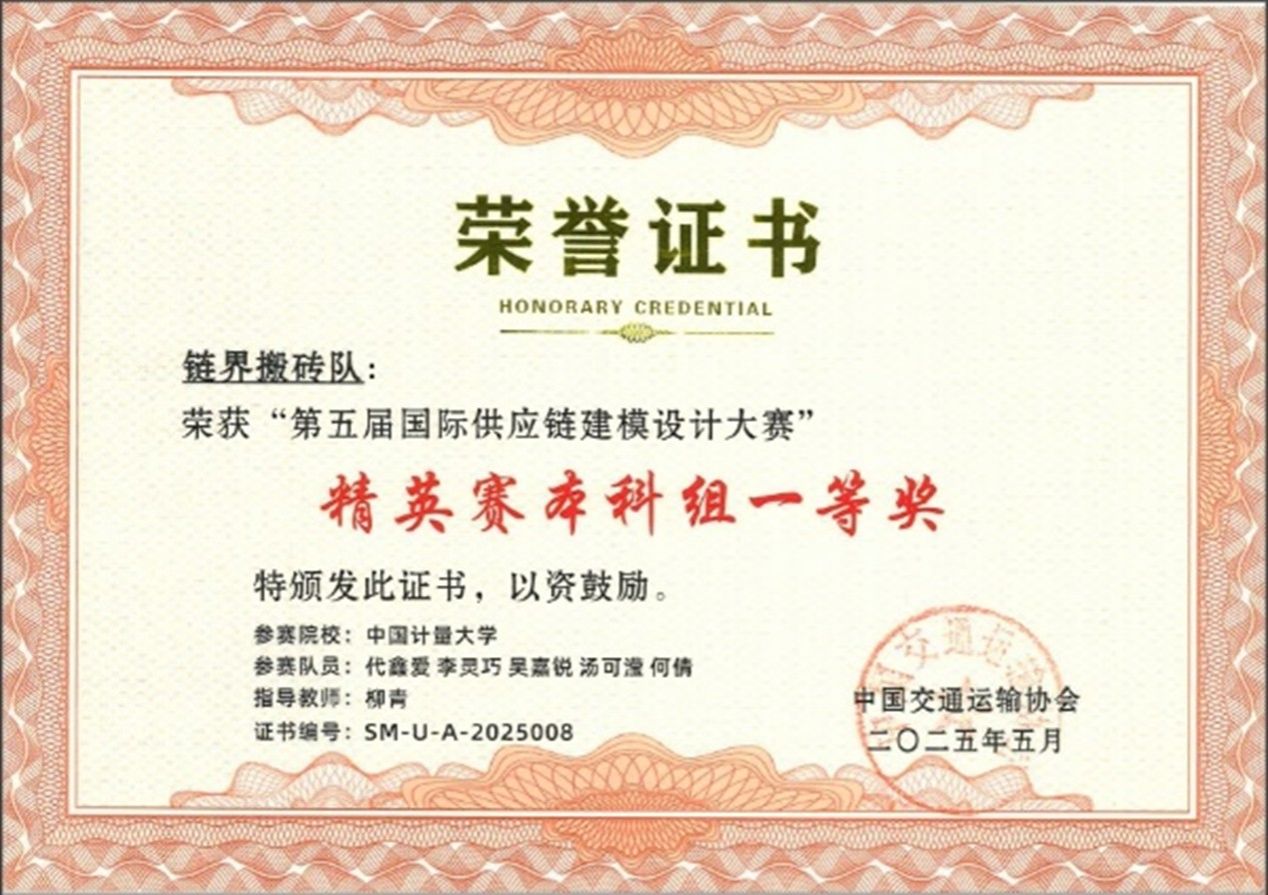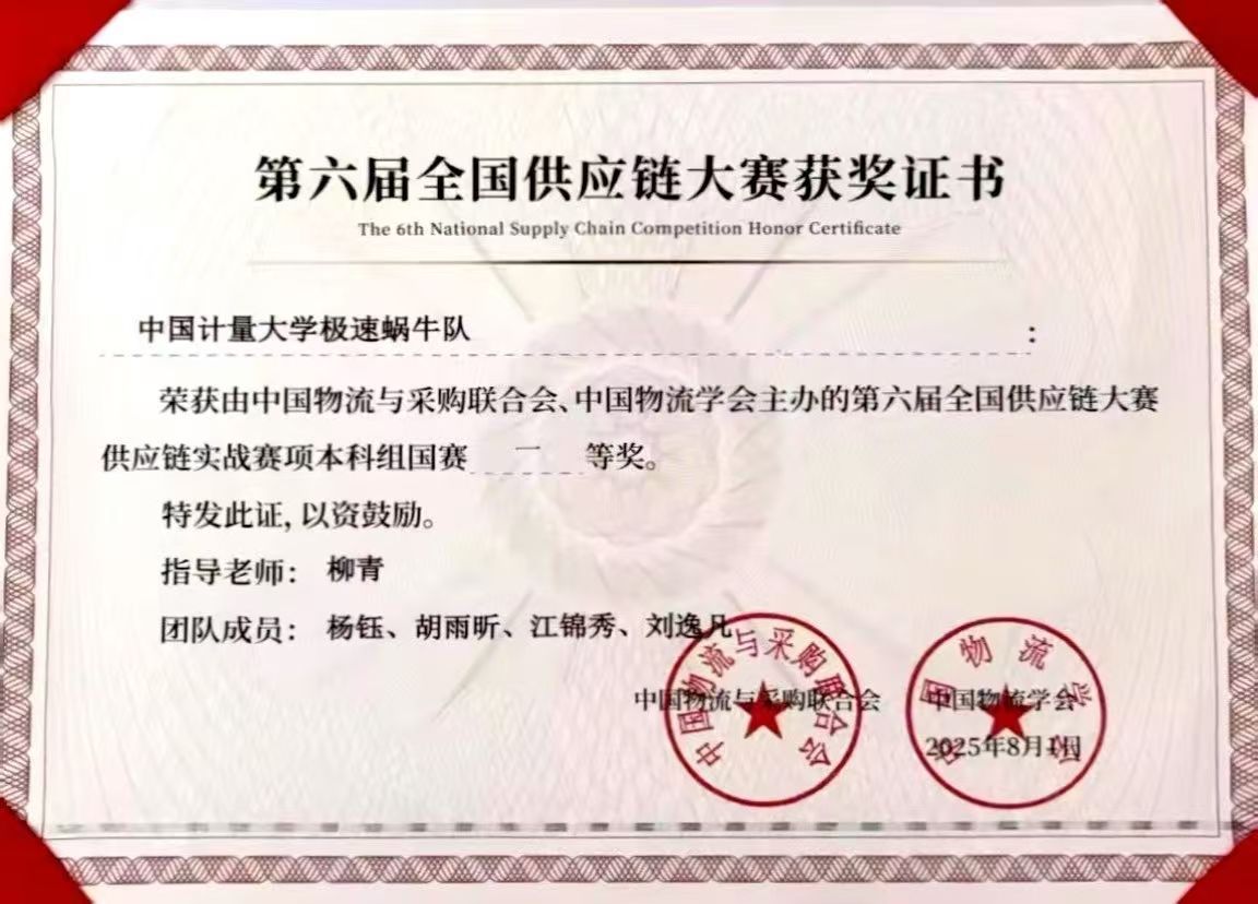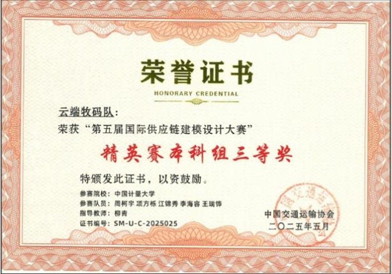 第五届国际供应链建模设计大赛决赛由中国交通运输协会主办。由柳青老师指导,工业工程专业学生代鑫爱、吴嘉锐、汤可滢、李灵巧、何倩组成的学生团队获全国一等奖;周柯宇、江锦秀、项方栎、李海荣、王瑞铧组成的学生团队获全国三等奖,指导教师获优秀指导教师奖,中国计量大学获最佳组织院校奖。大赛自2025年2月启动以来吸引了来自全国各地的3000余名参赛选手、指导教师,以及行业、企业和高校的专家积极参与。
