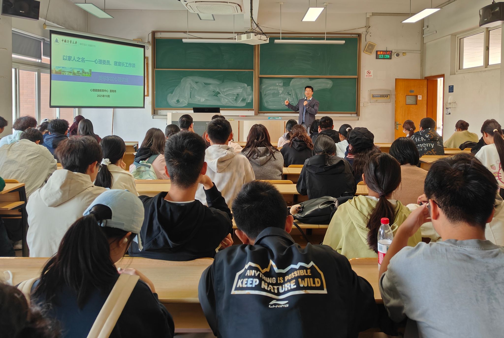 为进一步深化大学生心理健康教育工作,筑牢校园心理危机预防与干预的首道防线,提升新生心理骨干的助人意识与实务能力。10月28日,质标学院在环宇楼D502举办了2025级新生心理委员及寝室长心理专项培训。本次培训特邀校心理健康中心盖艳伟老师担任主讲,他以“家人之名”为主题,围绕“心理问题的认识、识别与应对”,特别聚焦寝室生活中遇到的实际问题,为新生心理骨干集中“充电”。