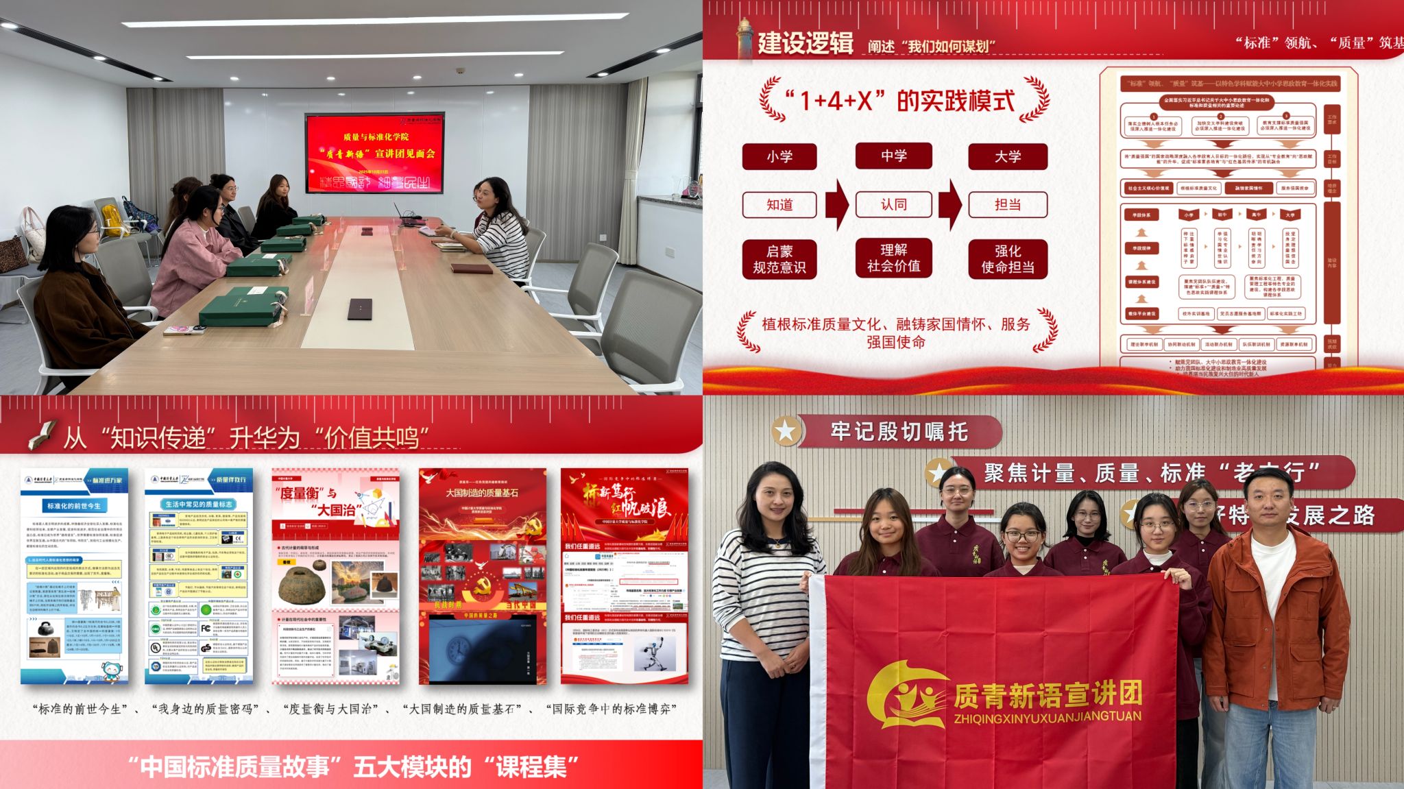 学院着力建强“质青新语”宣讲团,打造一支由全国党建样板党支部书记、思政辅导员等共同指导,52名党团员共同组成的价值引领型团队。10月31日中午,学院在弘德楼610党员之家举行隆重的纳新和授旗仪式。指导老师陈义龙深入阐述了宣讲团的创立初衷与责任使命,号召宣讲团要立足“中国质量标准故事”这一主线,用好已开发的“标准的前世今生”“我身边的质量密码”“度量衡与大国治”“大国制造的质量基石”“国际竞争中的标准博弈”等五大课程体系。学院党委副书记吴昕勉励团队成员要夯实专业基础、注重总结拓展,真正将“质量”与“标准”的学科特色转化为思政教育的独特优势,实现从专业传递到价值引领的转变。