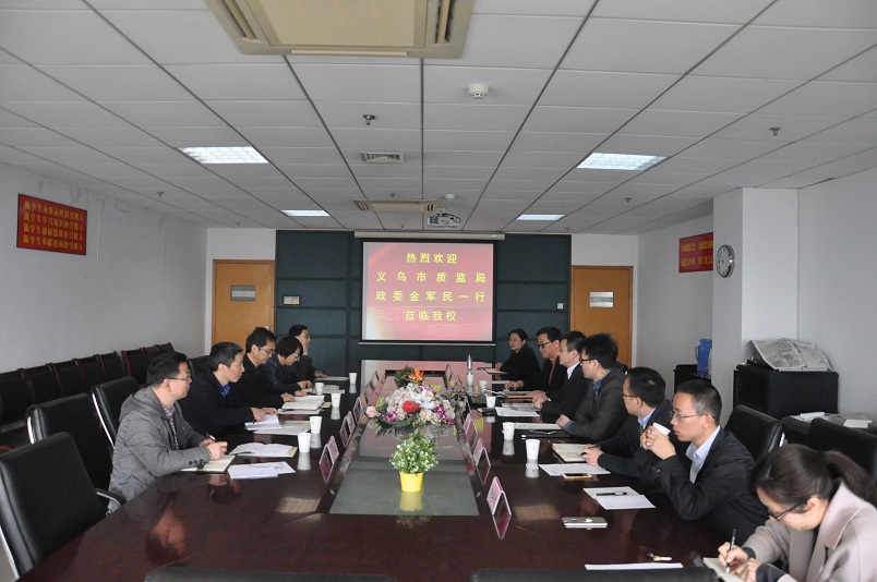 金军民政委首先说明了此次前来的迫切任务即特意来我院进行洽谈寻求合作。2016年10月23日在义乌市召开了“浙江制造”品牌建设高层研讨会,使义乌市成为全省品牌建设焦点。2017年3月31日,“浙江制造”品牌建设功能中心挂牌,正式落户义乌,作为标准的研讨、发布、推广基地,中心要定期向社会发布最新的“浙江制造”标准和产品,从而使义乌成为“浙江制造”品牌永久展示中心。随后,贾江鸣副局长表示义乌是县级市,标准化工作力量比较弱,人才和技术与经济发展不太匹配,而标准化学院在人才、信息、资源等方面有一定的优势,希望在标准化战略实施方面得到标准化学院的大力支持并合力推进,促使国际贸易和科技创新的义乌特色通过国际交流和各种展会等义乌资源带动标准走出去,以推进“浙江制造”走向世界。最后双方初步达成了合作共识。
