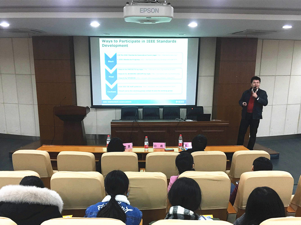 11月25日下午,IEEE标准协会美国总部全球战略经理孙敬、IEEE中国区标准经理赵盟、IEEE高级会员、CATE Global智库咨询公司总裁袁昱等一行3人来到我校,为标准化学院师生开设关于IEEE标准的专场讲座。