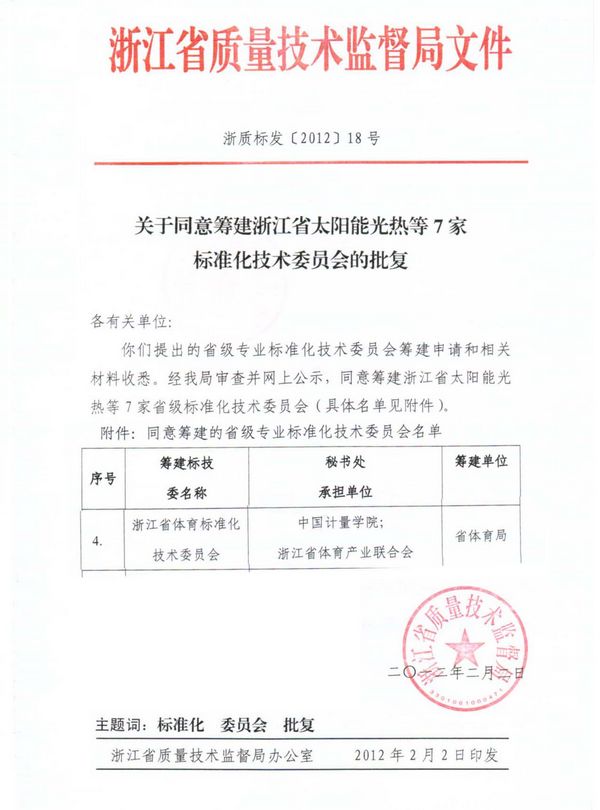经浙江省质量技术监督局审查并网上公示,浙江省质量技术监督局近日下文(浙质标发[2012]18号文件)同意我校与浙江省体育产业联合会共同筹建浙江省体育标准化技术委员会。浙江省体育标准化技术委员会的筹建成立标志着我校与浙江省体育局有关体育标准化的战略合作进入实质阶段。自2010年签署战略合作协议以来,在双方领导的高度重视下,标准化学院根据双方战略合作协议精神扎实推进浙江省体育标准化研究与培训基地工作,相继成立浙江省体育标准化指导委员会,举办了浙江省体育标准化论坛,搭建了政府有关职能部门、专家学者和企业的交流平台,承接了标准研制和咨询项目等等,工作开展得有声有色。不但得到了浙江省体育局领导的高度评价,浙江省作为体育标准化工作开展较早的省份,也得到国家体育总局等有关部门的高度关注。相关活动还受到浙江日报等媒体的高度关注和大量报道,有效扩大了学校的声誉。