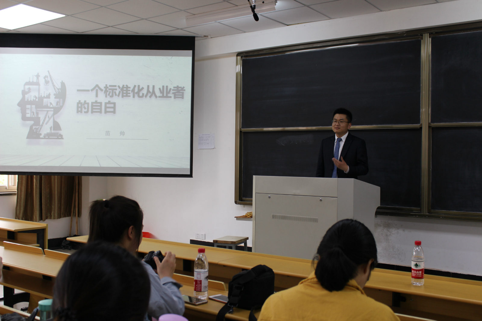 讲座以“一个标准化从业者的自白”为主题,苗帅结合自己在标准化行业领域内多年的从业经验与同学们分享,他帮助同学们分析国家政策的有利形势,指引标准化专业发展的方向,为大三同学即将面对的就业出路选择打开了思路,也对就业所需的努力给予了悉心的指导。苗帅说道,标准化专业的职业发展前景很广阔,同学们须增强核心竞争力,在未来的职业成长中努力成为行业领域的“专家”。讲座现场高潮迭起,同学们兴致昂然,掌声频频,从心底里佩服这个年轻的标准化先驱,对于他所分享的内容也深感受益颇丰。