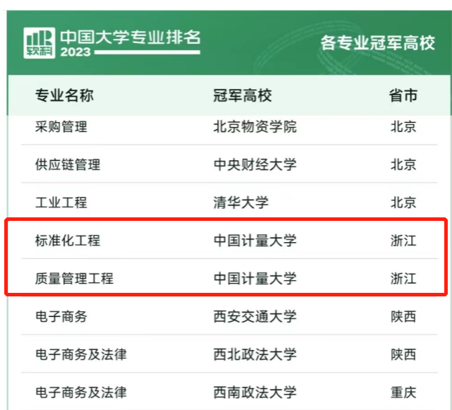 近日,高等教育专业评价机构软科发布了“2024年软科中国大学专业排名”,排名包括810个专业,涉及93个专业类、12个专业门类。据榜单显示,中国计量大学质量与标准化学院标准化工程、质量管理工程专业再次荣膺全国第一,两个专业均获评A+。