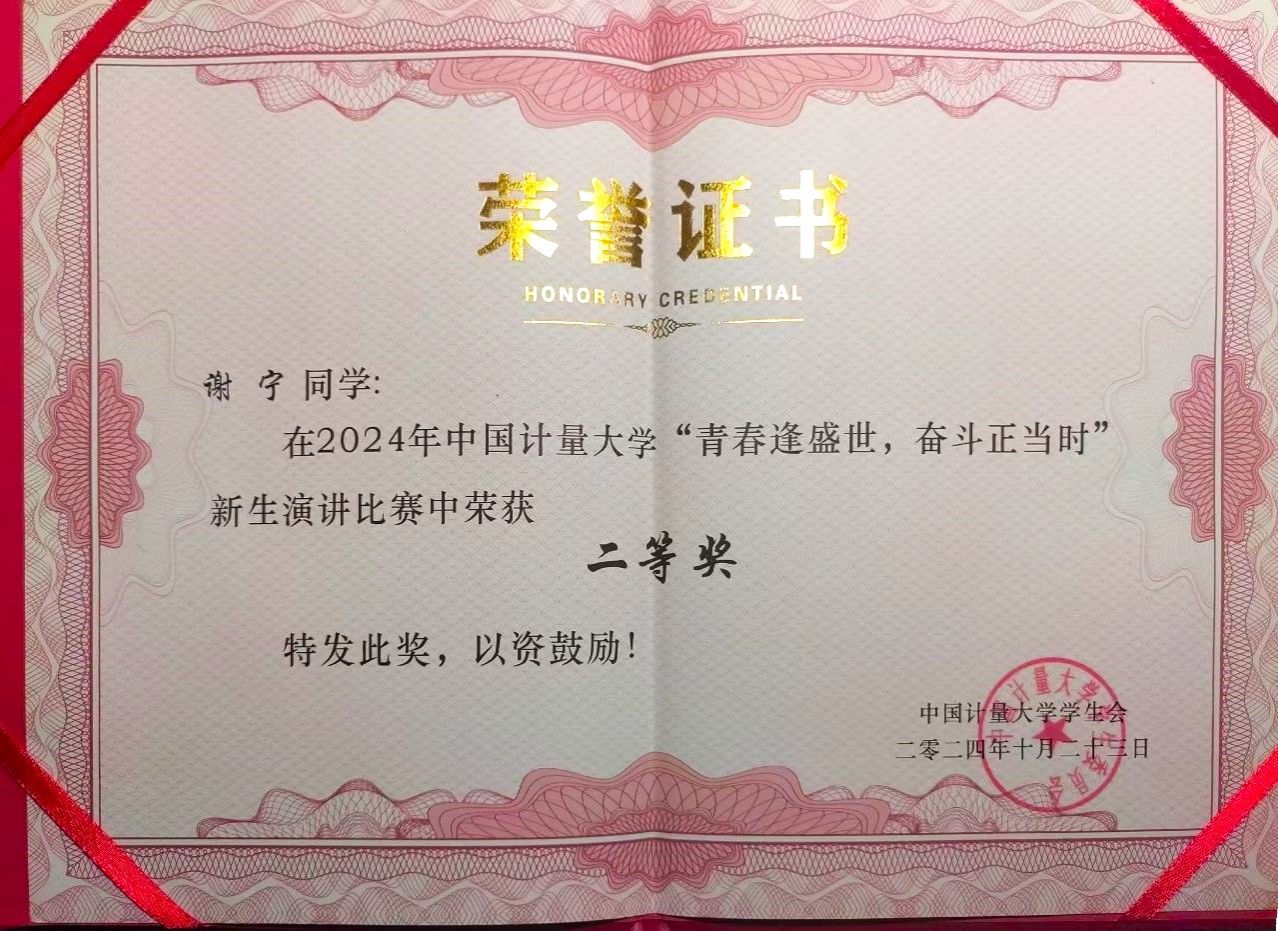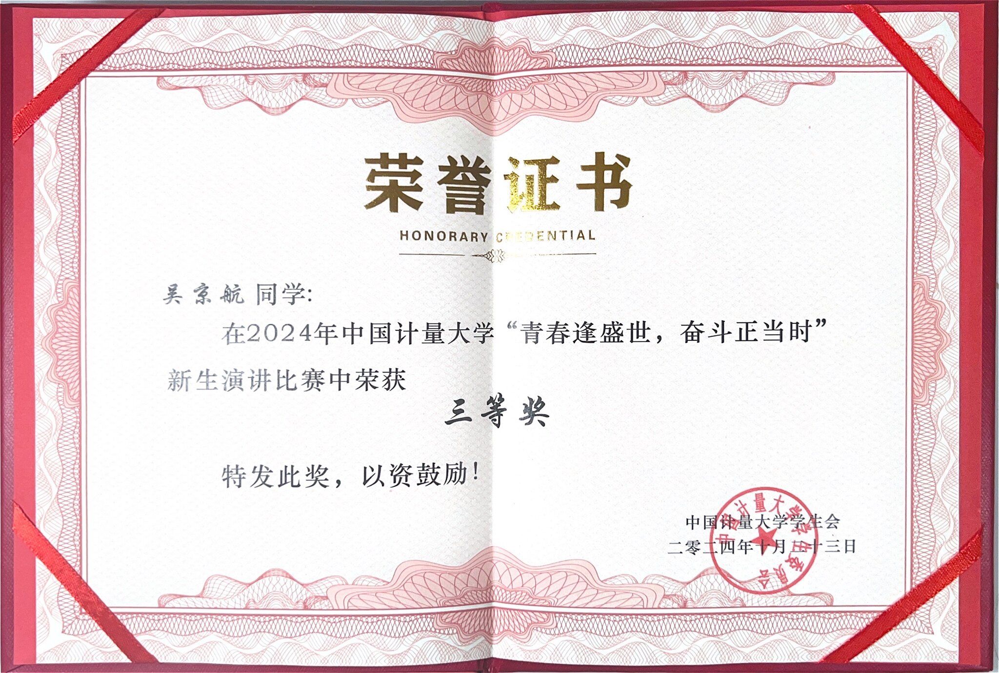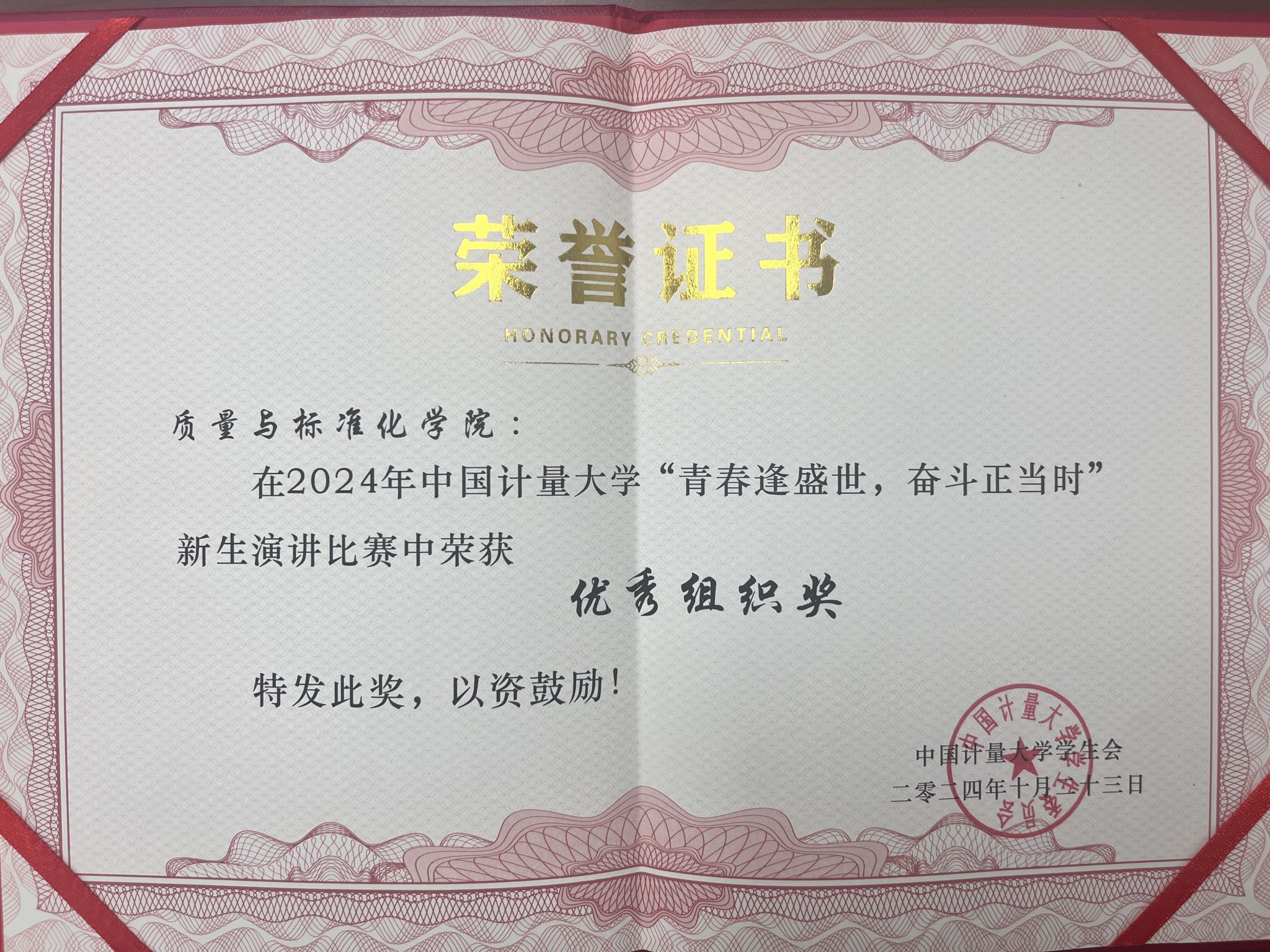 为庆祝新中国成立七十五周年,展现新时代青年的蓬勃朝气,10月23日晚,中国计量大学“青春逢盛世,奋斗正当时”新生演讲比赛决赛在启明活动中心B303举行。我院24标准化4班谢宁荣获校级二等奖,24卓越1班吴京航荣获校级三等奖,学院获优秀组织奖。