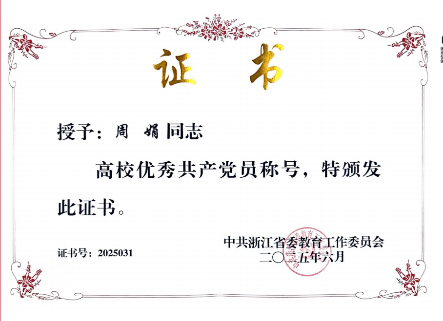 今年5月以来,省委教育工委在全省高校组织开展了优秀共产党员、优秀党务工作者和先进基层党组织评选工作。经高校推荐、综合遴选,《中共浙江省委教育工作委员会关于表彰高校优秀共产党员、优秀党务工作者和先进基层党组织的决定》发布确定60名优秀共产党员、30名优秀党务工作者、30个先进基层党组织。其中,我院周娟老师获评浙江省高校优秀共产党员荣誉称号。