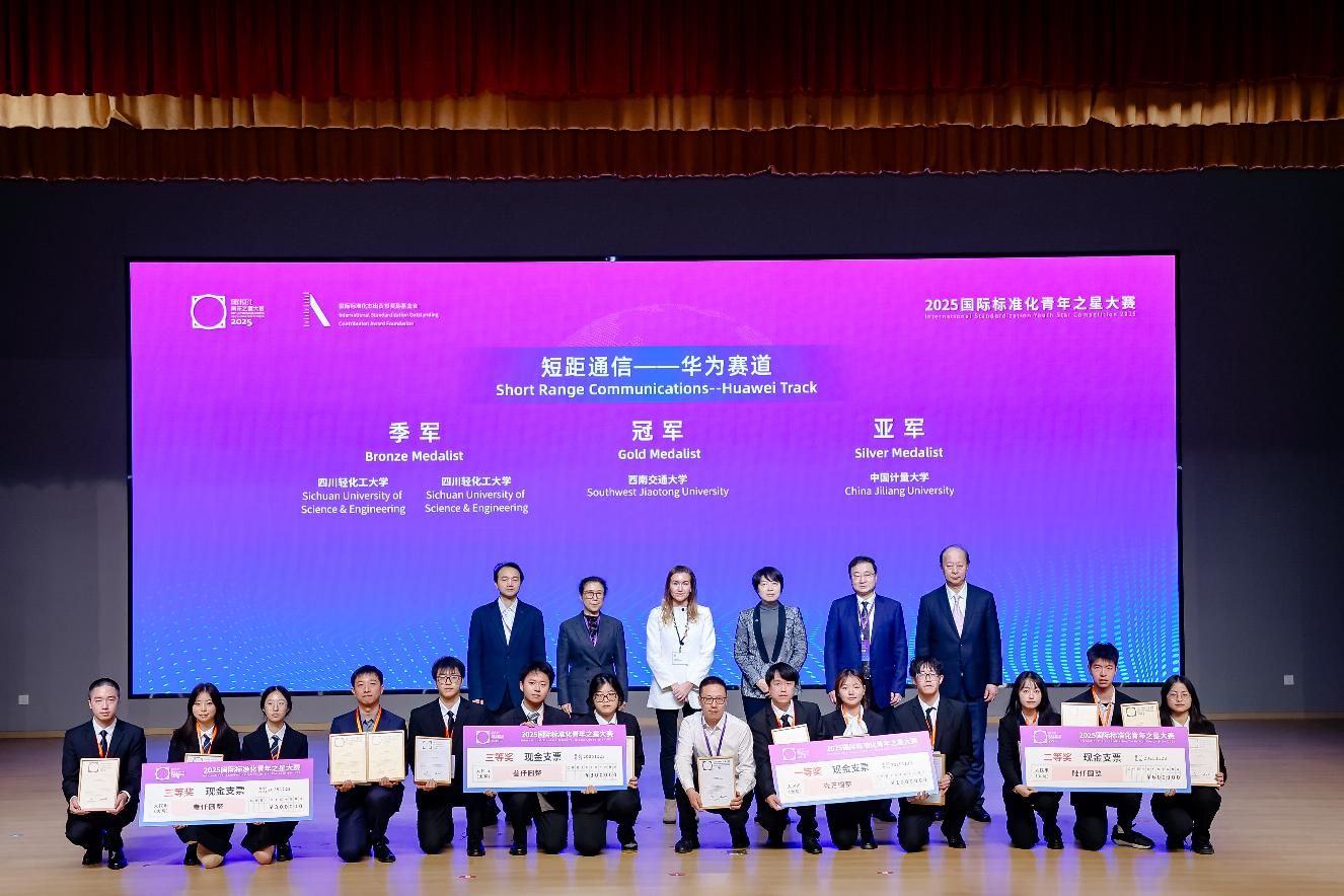 本次大赛坚持 “业界出题、学界答题” 的核心模式,精准对接企业标准化需求,为高校学子搭建了理论联系实际的高端实践平台。在华为技术有限公司专项设立的 “短距通信” 主题赛道中,我校团队展现了极强的协作能力与专业功底。在管工学院硕士生导师李战国的指导下,由人外学院 23 级英语专业 1 班邱韵颐、生命学院 24 级卫生检验与检疫专业 1 班毛宁、能安学院 24 级安全工程专业 2 班林成预组成的队伍,针对短距通信领域标准化痛点,提交的标准提案兼具技术前瞻性、标准规范性与产业应用潜力,赢得评审专家一致好评。决赛现场,三位同学以逻辑严谨的成果汇报、精准高效的答辩表现,清晰阐释了提案的核心技术路径与标准化价值,最终从众多强队中突围,荣获该赛道全国亚军。在同期举办的 “2025 ISOCAF 青年大使” 评选中,邱韵颐同学凭借卓越的英语表达能力、对标准化事业的深刻见解以及出色的国际交流素养,在英文演讲环节拔得头筹,经现场投票当选本次大赛唯一的 “2025 ISOCAF 青年大使”,成为我校复合型人才培养的生动缩影。