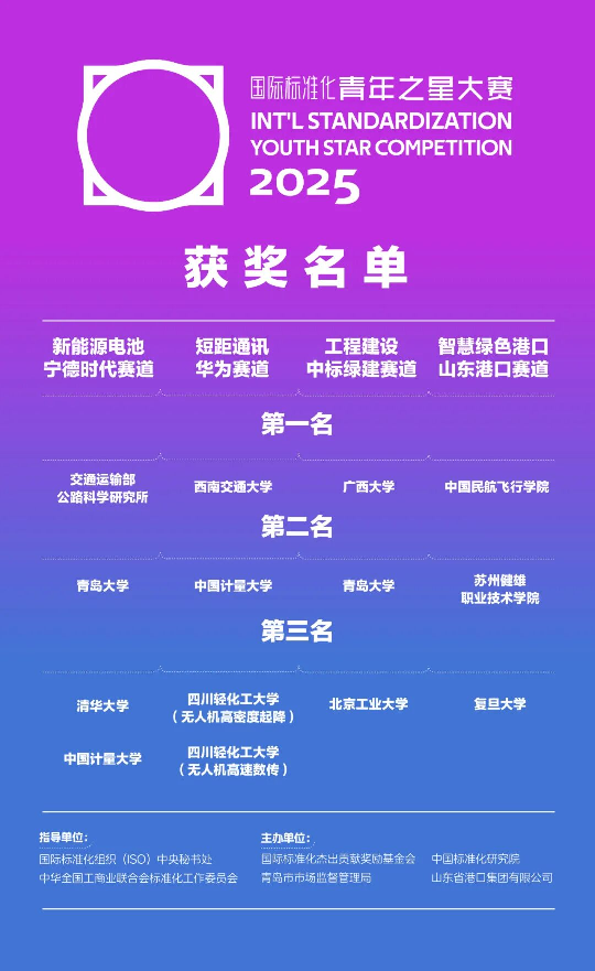 11 月22日至23日,2025 国际标准化青年之星大赛决赛及颁奖大会在山东青岛圆满落幕。作为国际标准化领域的高水平赛事,本次大赛吸引了全国236 支队伍同台竞技,最终 14 支队伍脱颖而出晋级决赛。我校学子首次入围决赛便不负众望,凭借扎实的标准化专业素养与创新实践能力,斩获 1 项全国亚军、1 项全国季军及 1 项个人最高荣誉,用亮眼战绩彰显了学校标准化特色办学的深厚底蕴与育人成效。