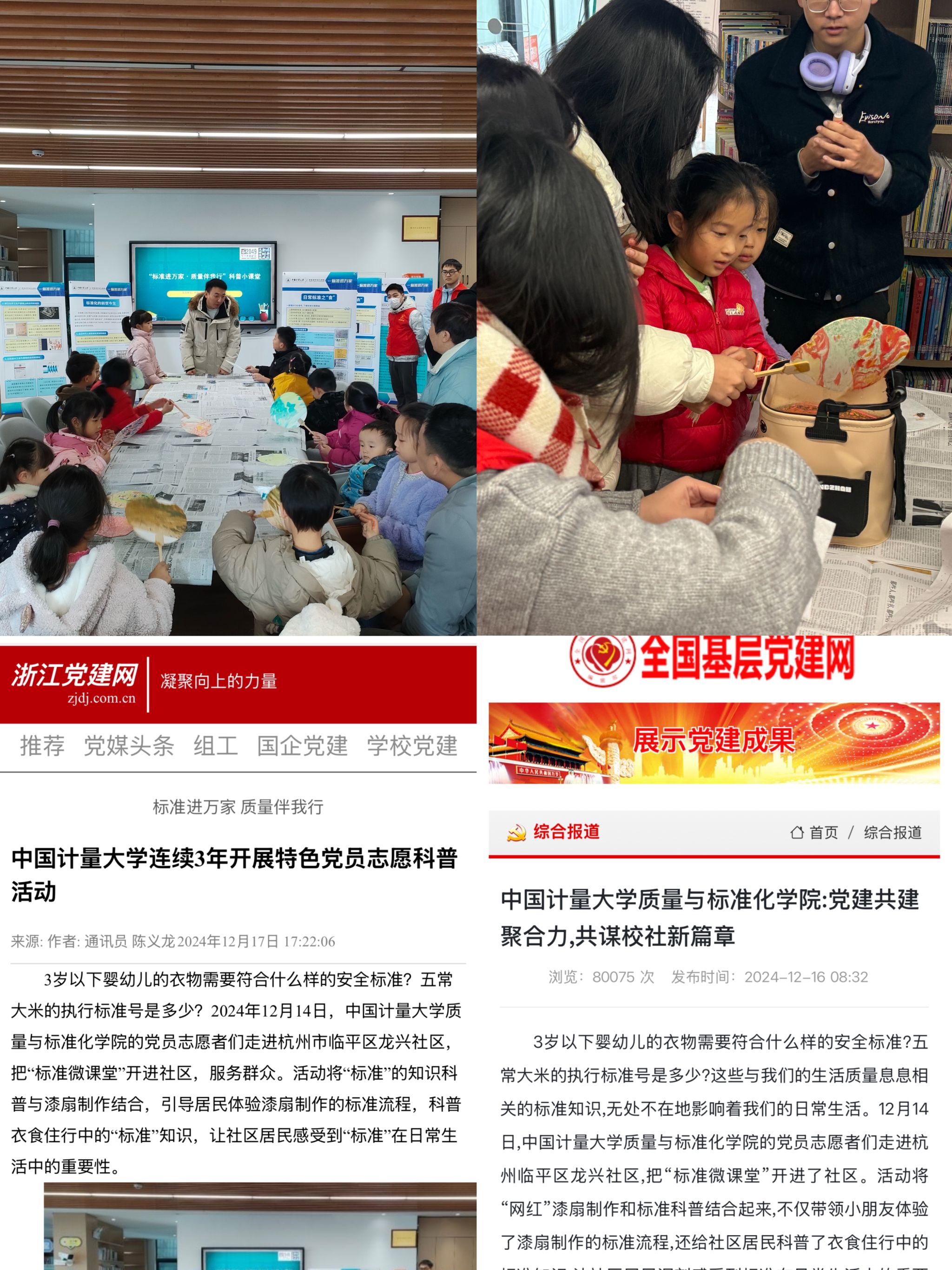 随后,学院学生党团员化身“标准科普小讲师“,给社区小朋友及家长上了一堂别开生面的标准科普微课堂。将“标准”的知识与漆扇制作结合,引导小朋友体验漆扇制作的标准流程,科普衣食住行中的“标准”知识,让社区居民感受到“标准”在日常生活中的重要性。活动受到浙江党建网、全国党建基层网相关报道。