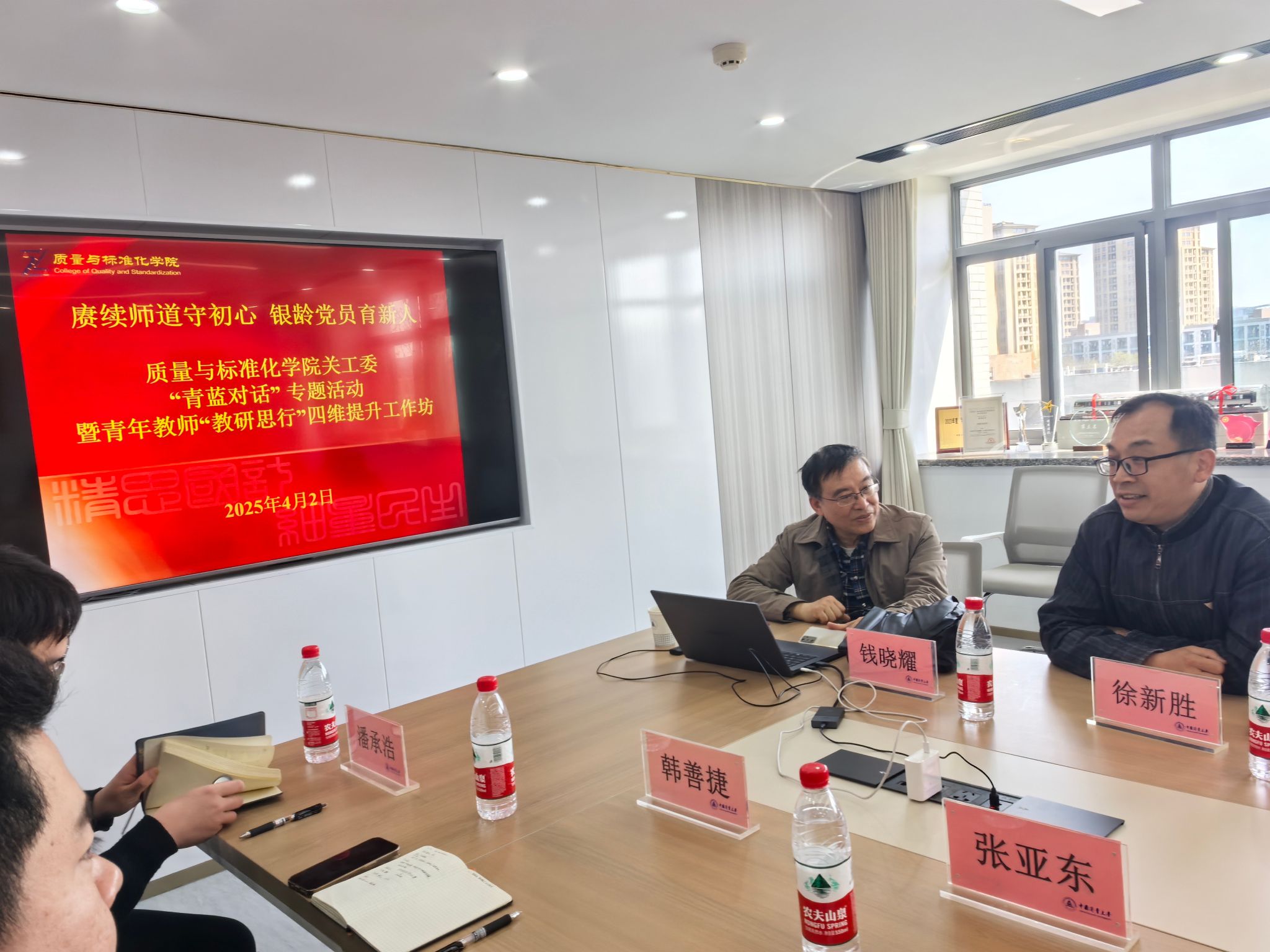 五老领航传薪火,青蓝共筑育才路。为深入贯彻落实立德树人根本任务,充分发挥关工委“五老”资源优势,强化青年教师职业发展引领,质量与标准化学院关工委于4月2日在弘德楼610举办“青蓝对话”专题活动暨2025年青年教师“教研思行”四维提升工作坊。活动聚焦师德传承与教学科研能力提升,特邀学院关工委副主任、银铃党员钱晓耀现场指导,学院副院长徐新胜主持,质量教工党支部书记周娟、教工党员代表及新进青年教师等20余人共同参与。
