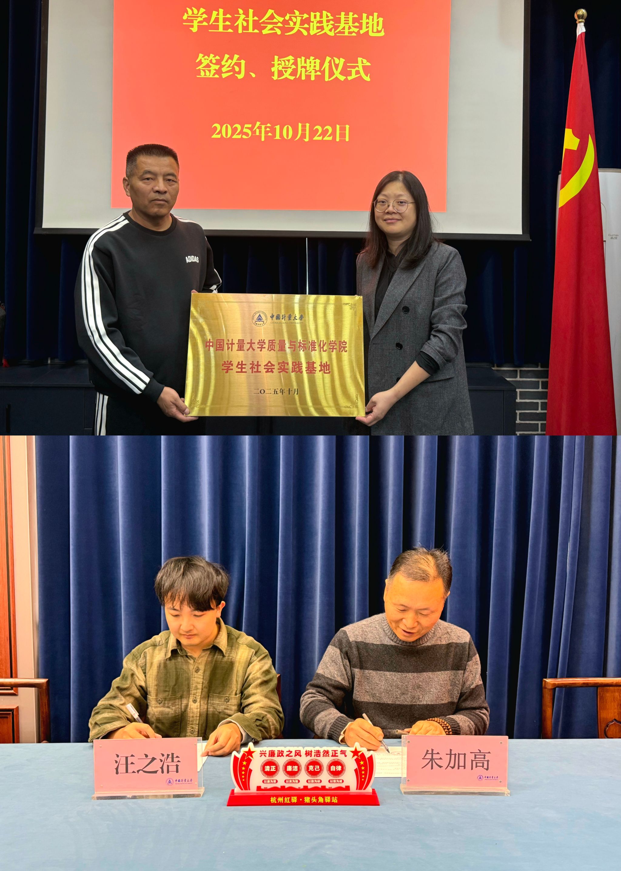 活动现场,质标学院与杭州红驿文化发展有限公司举行了学生社会实践基地签约、授牌仪式。今年暑期,学院“铮铮之音”学生团队曾在该驿站开展“潮涌红岸·塘韵新程”社会实践,以青年视角挖掘海塘文化与廉洁精神的时代价值,调研成果在校纪委举办的2025年“赓续红色根脉 讲好廉洁故事”暑期社会实践活动中获得一等奖,为学院党委深化党建引领与廉洁文化建设积累了有益经验,形成了以实践促育人、以廉洁塑风尚的良好氛围。此次双方携手,将以签约为新起点,深化校地共建、资源共享,共同打造集思想教育、社会实践、廉洁文化教育于一体的综合育人平台,为青年学生搭建了解社会、服务社会、锤炼品格的“第二课堂”。
