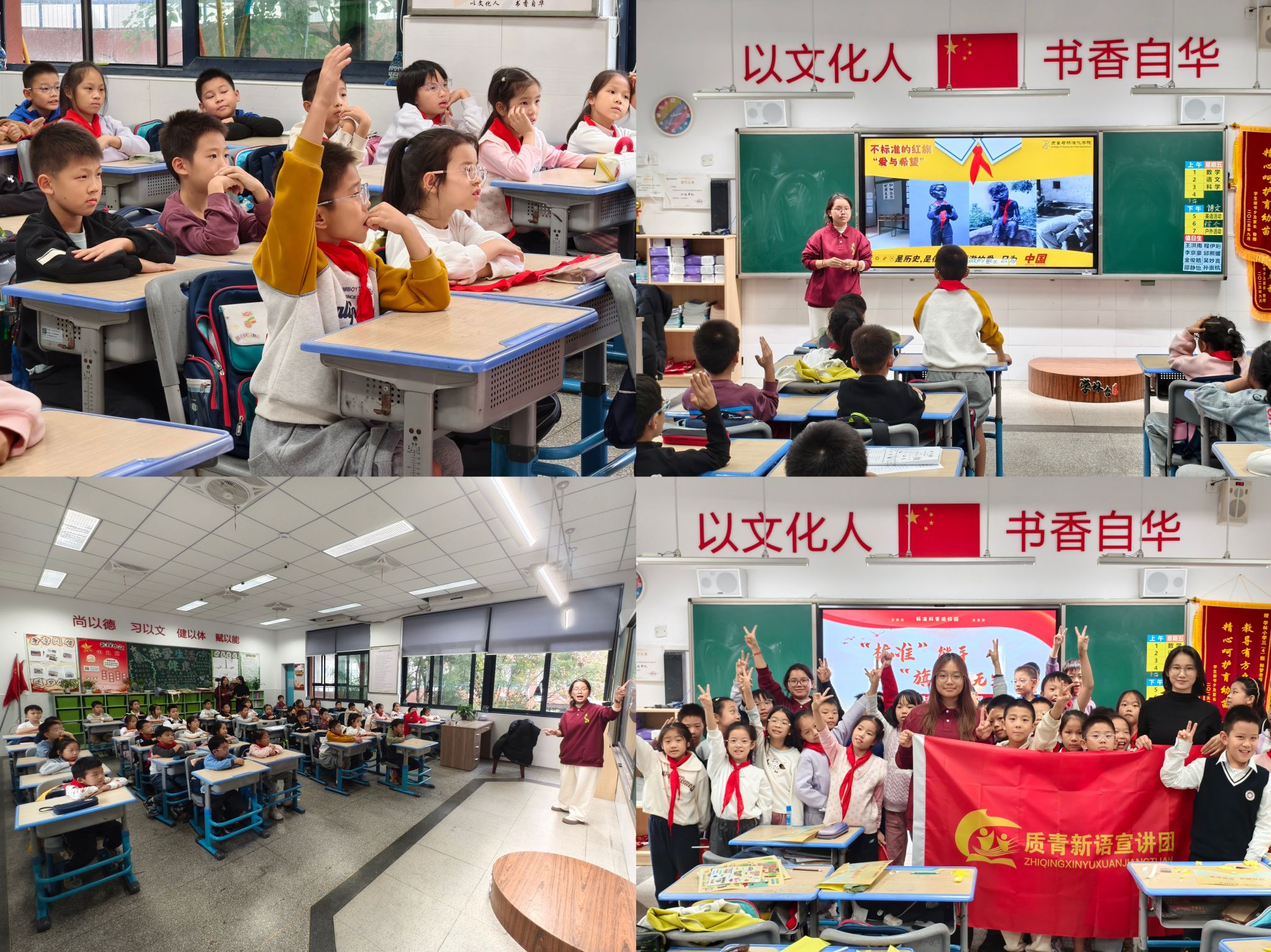 10月31日下午,宣讲团骨干成员、23级首批入党的新疆姑娘蒋艾颖,带领“质青新语”团队赴学林小学开展了一场以《从“缝织的信仰”到“质量的脊梁”》为题的少先队队课。她从日常生活中的标准切入,引出“标准里的红色故事”和“大国质量的崛起之路”。课堂上,她深情讲述了《红岩》中革命志士在狱中凭想象缝制“五星红旗”的感人故事,也描绘了中国质量之父“刘源张”为国家质量事业发展奉献一生的事迹。孩子们通过亲手制作符合标准的小红旗,不仅理解了“质量”“标准”的现实含义,更让家国情怀悄然根植于心。这堂课的设计,正是学院将“专业所学”对接“质量强国”所需的微观实践,让宏大的国家方略以可知可感的方式浸润青少年心田。