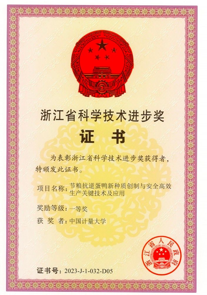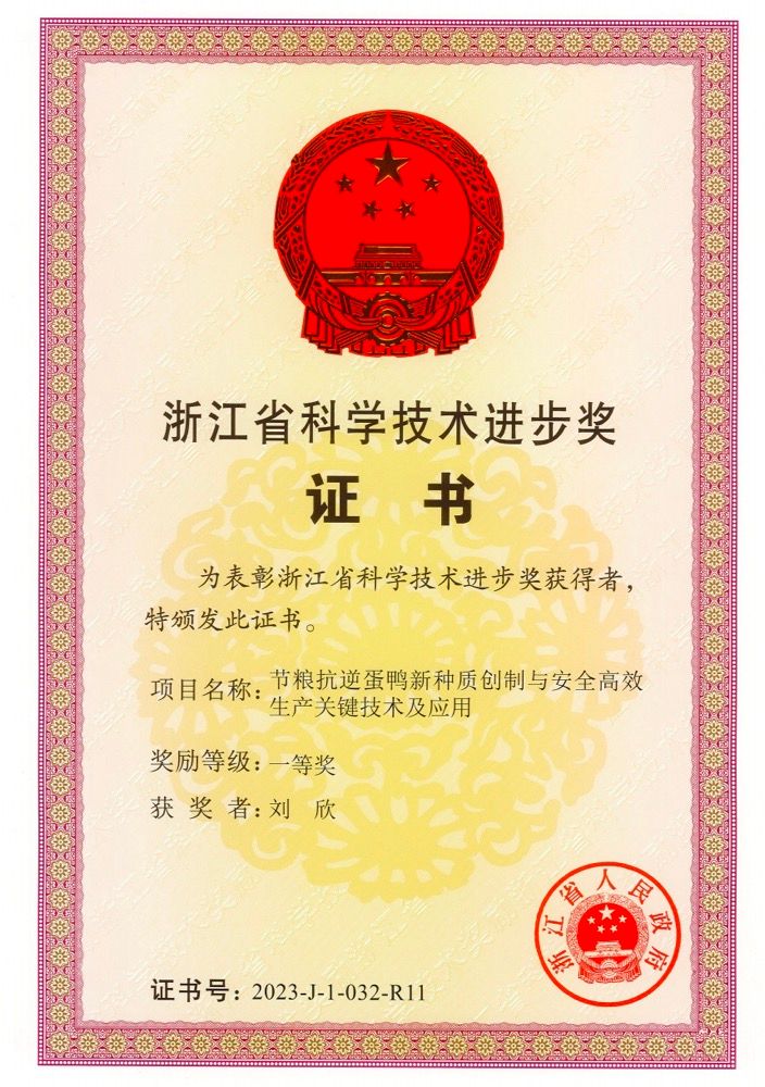 近日,加快建设创新浙江因地制宜发展新质生产力动员部署会暨全省科学技术奖励大会在杭州召开,大会揭晓了2023年度浙江省科学技术奖结果。我院副院长刘欣教授参与的“节粮抗逆蛋鸭新种质创制与安全高效生产关键技术及应用”项目,荣获浙江省科学技术进步奖一等奖