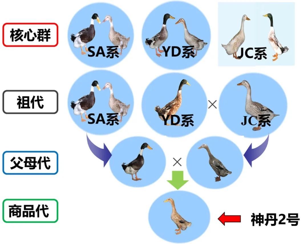 “节粮抗逆蛋鸭新种质创制与安全高效生产关键技术及应用”成果利用绍兴鸭、缙云麻鸭等地方蛋鸭品种,育成了我国首个在全程笼养下选育成功的节粮抗逆蛋鸭新品种-神丹2号蛋鸭,通过国家新品种审定,综合生产性能全面领先。发现了47个具有重要育种价值的功能基因和分子标记,创建了基于全基因组关联分析的蛋鸭分子育种技术,6个世代产蛋遗传进展达22.5个,饲料利用效率提高7.5%。