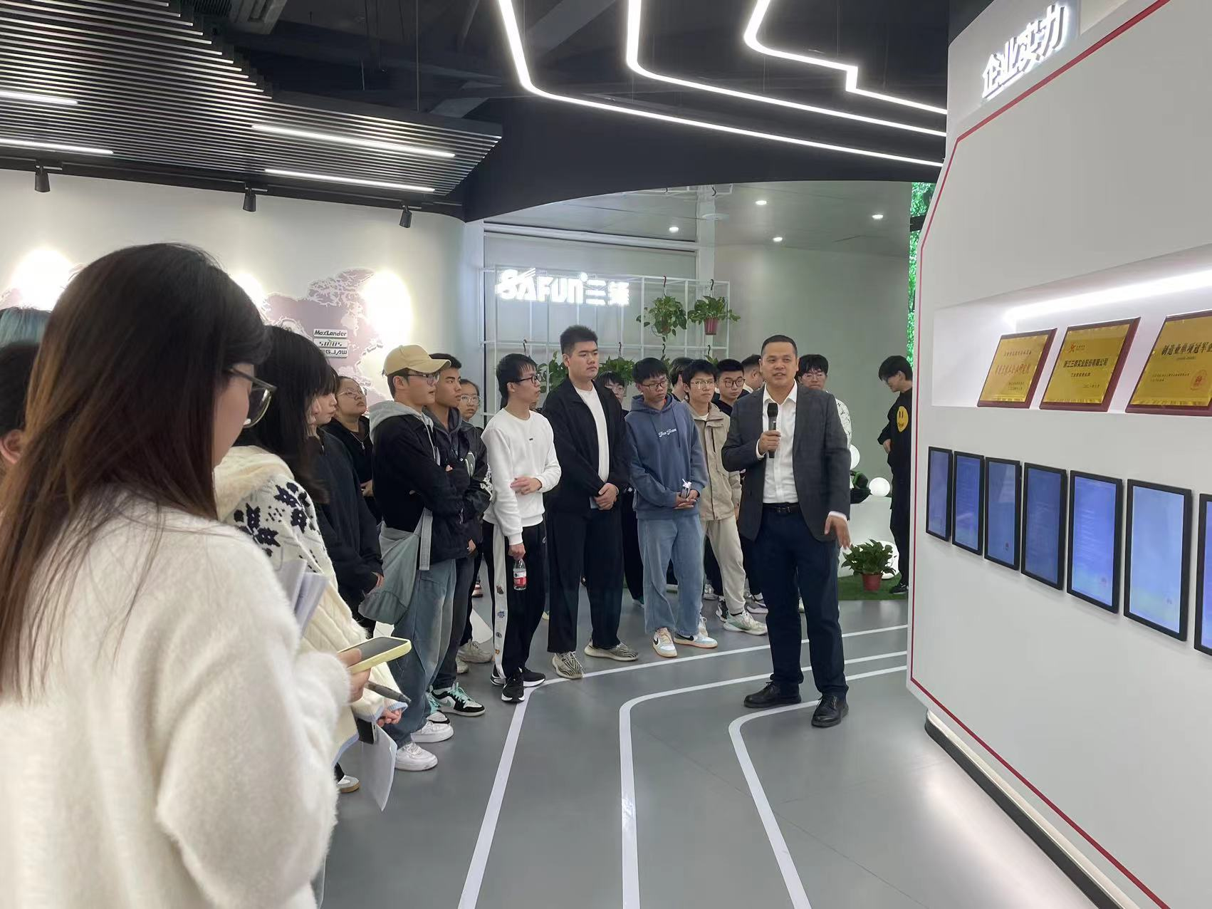 公司高管吴四红,总裁办助理金江瑛等公司领导热情接待了到访的师生们。在集团讲解员的带领和介绍下,师生一行实地了解了浙江三锋实业股份有限公司三十年的创业发展历史,在全球电动工具市场中的竞争优势以及先进智能制造业的技术。学生们深入生产车间、现代智能仓储中心、国家CNAS认可实验室等地进行了参观,并和企业技术负责人进行了面对面的交流。目睹了产品从研发到生产到品控销售的整个过程,直观感受到现代智能制造企业的生产技术强大和企业对标准化和质量的重视程度。深刻体会到了作为全球知名的电链锯制造商和销售商和中国电动工具龙头企业对产品精益求精的态度和对市场负责任的担当精神。这也为标准化工程专业的学生们上了一堂很好的生动实践课。作为我校产学研协同育人的合作单位,公司负责人对标准化工程专业给予了高度评价,希望学校能持续给企业输送优秀人才。