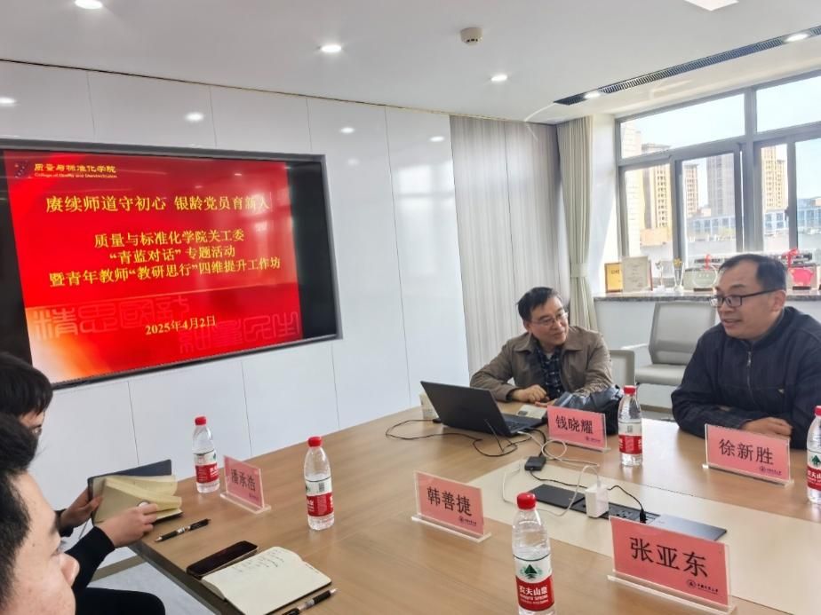 五老领航传薪火,青蓝共筑育才路。为深入贯彻落实立德树人根本任务,充分发挥关工委“五老”资源优势,强化青年教师职业发展引领,质量与标准化学院关工委于4月2日在弘德楼610举办“青蓝对话”专题活动暨2025年青年教师“教研思行”四维提升工作坊。活动聚焦师德传承与教学科研能力提升,特邀学院关工委副主任、银铃党员钱晓耀现场指导,学院副院长徐新胜主持,质量教工党支部书记周娟、教工党员代表及新进青年教师等20余人共同参与。