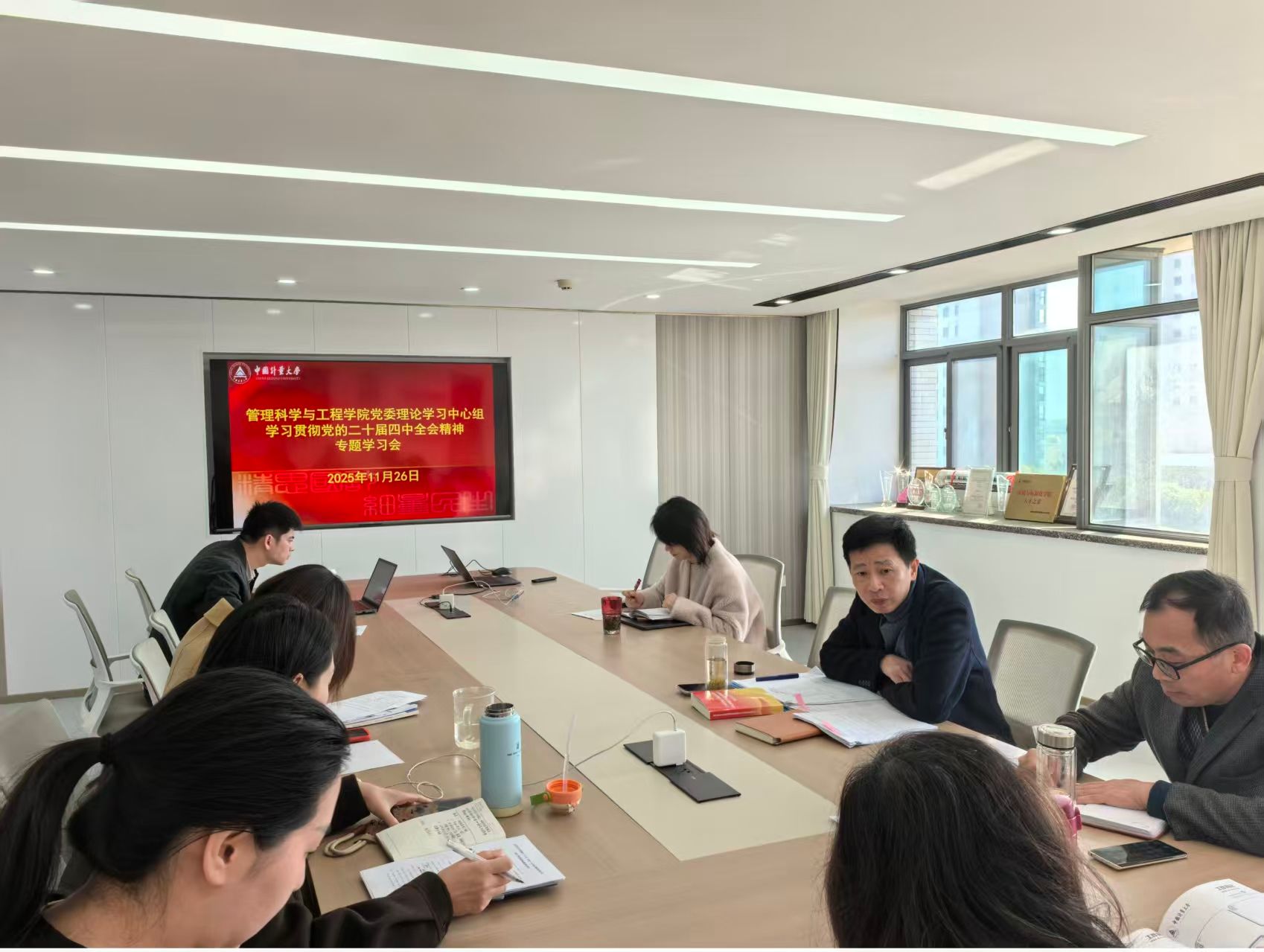 11月26日,管理科学与工程学院党委理论学习中心组在弘德楼610召开学习会,专题学习党的二十届四中全会精神,并结合学院学科专业特点,研究部署贯彻落实举措。学院党政班子成员、党委委员、学工办主任参加会议,会议由学院党委书记黄乐富主持。