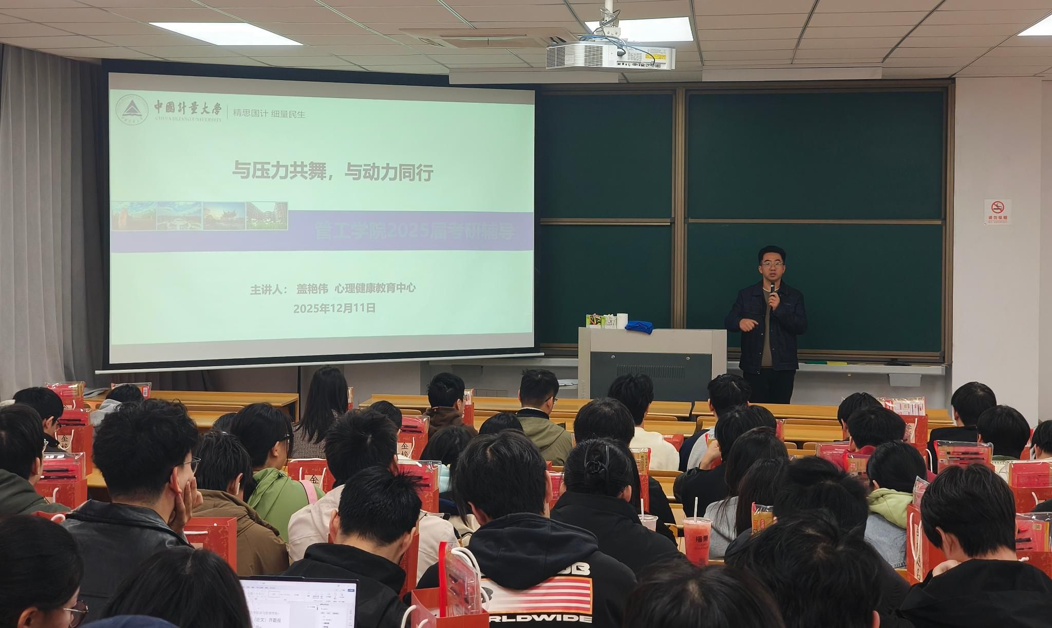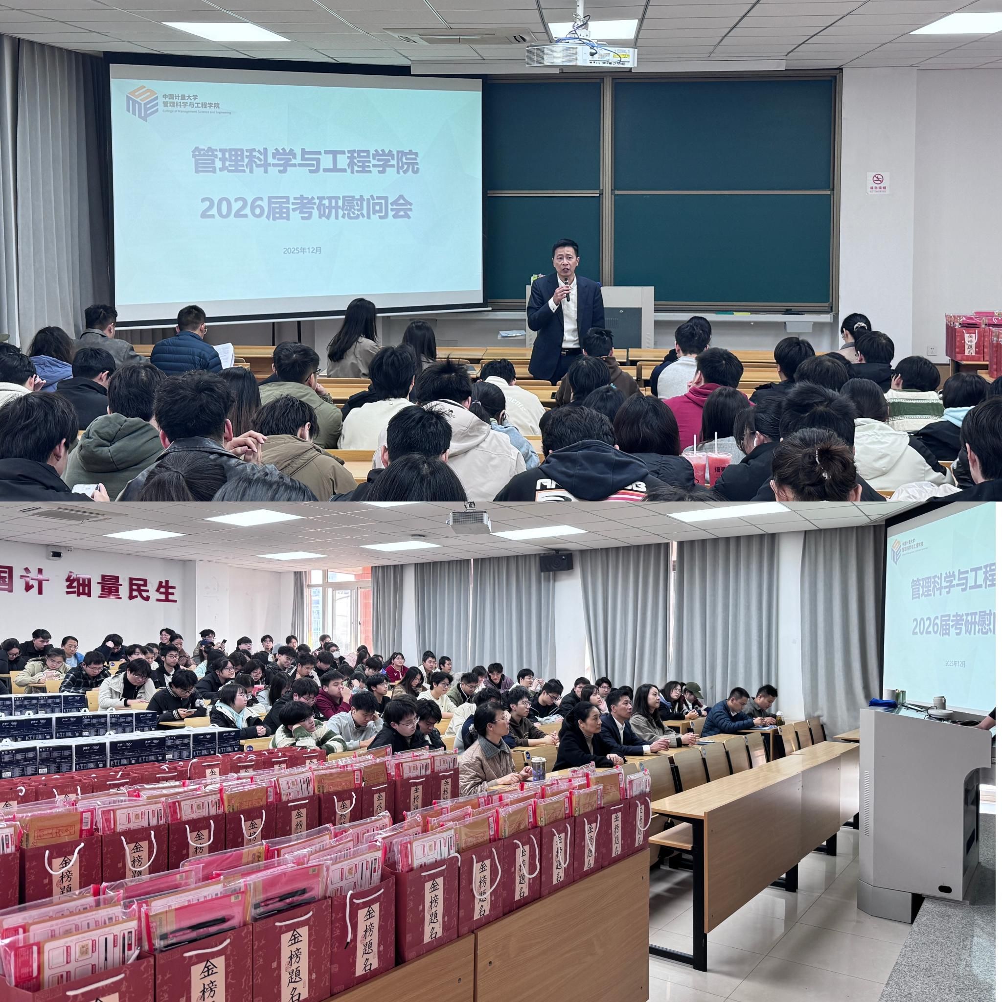 冬日渐深,研考在即。为鼓舞考研学子士气,坚定必胜信念,有效缓解冲刺阶段的心理压力与焦虑情绪,管理科学与工程学院(质量与标准化学院)于12月11日下午在翔宇楼302举办了2026届考研学生慰问活动。学院党委书记黄乐富、副书记吴昕,质量管理工程专业负责人项荣、标准化专业负责人颜鹰,毕业年级辅导员胡晓南、王炳成、班主任代表,以及校心理健康中心盖艳伟一起为正在备考冲刺的百余名学子送上学院的深切关怀与真挚鼓励。