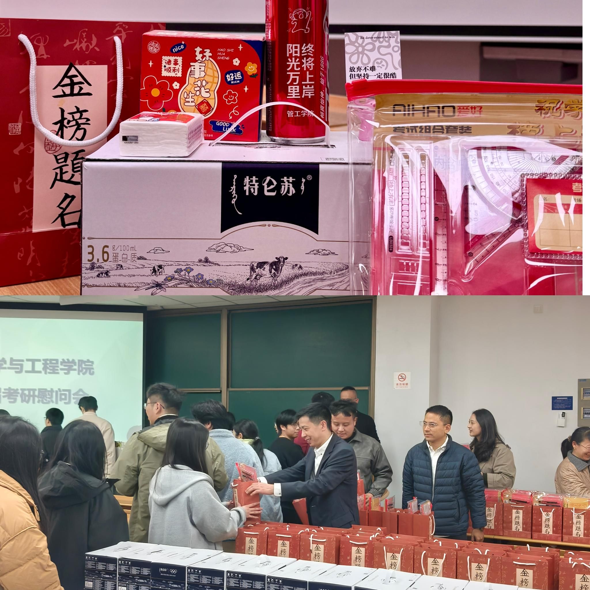 慰问活动现场温情洋溢,在场的教师为考研学子一一发放了学院精心准备的“考研慰问大礼包”。礼包中既有补充营养的牛奶、寓意“妙笔生花”的文具套装,也包含寄寓“金榜题名”的祝福卡片——每一件礼物都承载着学院的细致用心与真挚祝愿,盼学子们“能量充沛”“梦想成真”。