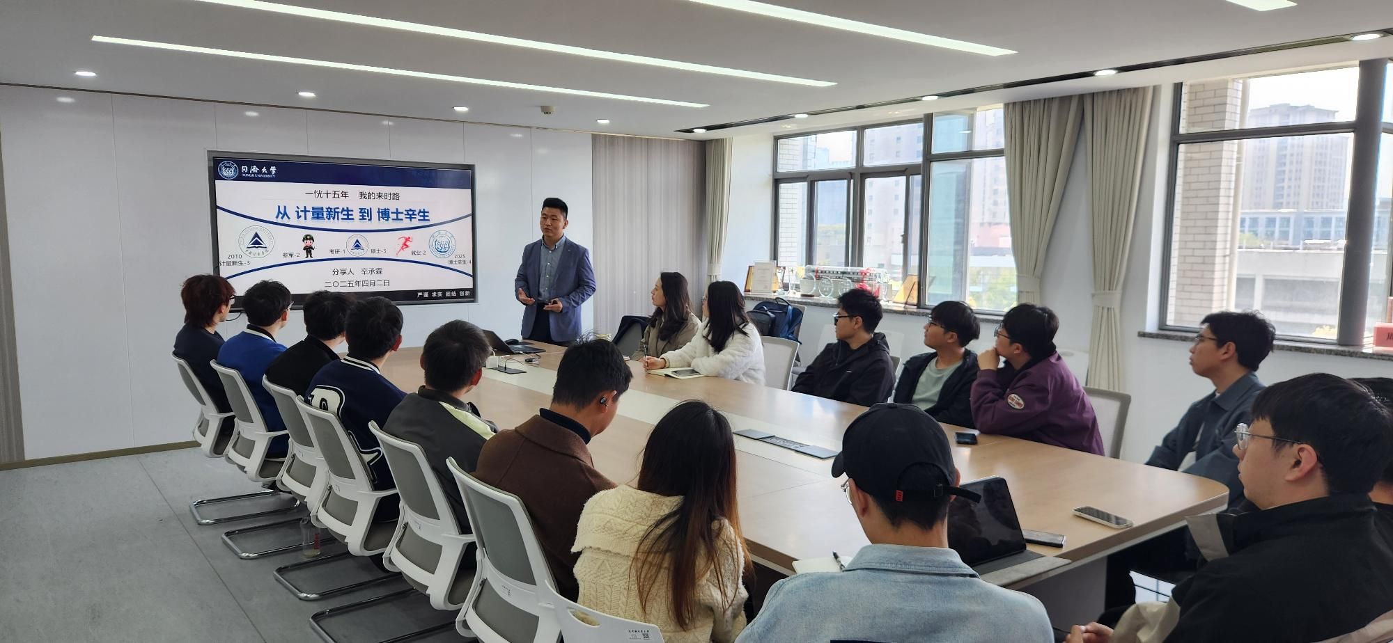 当军旅淬炼遇上学术深耕,会迸发怎样的成长火花?4月2日,质标学院“校友领雁计划”迎来特殊一课:从本硕计量新生到同济大学博士“辛”生,兼具军人本色与科研韧性的优秀校友、全国大学生就业创业典型人物辛承霖重返母校,他从自身“军旅+学术+实践”的复合成长经历展开,以“三次人生跨越”的成长密码,分两个场次为在校本、硕学生们解码生涯发展的多维可能。学院党委副书记吴昕为这位“跨界成长榜样”颁发“校友领航员”聘书,研究生秘书姚蕾、辅导员胡晓南以及百余名学生共赴这场充满力量的成长对话。